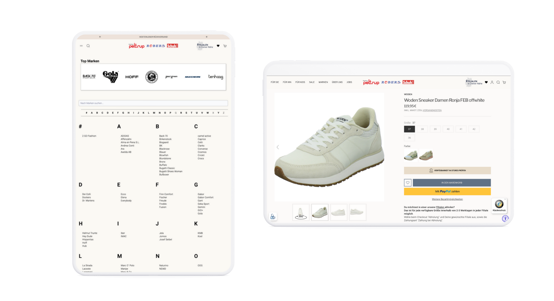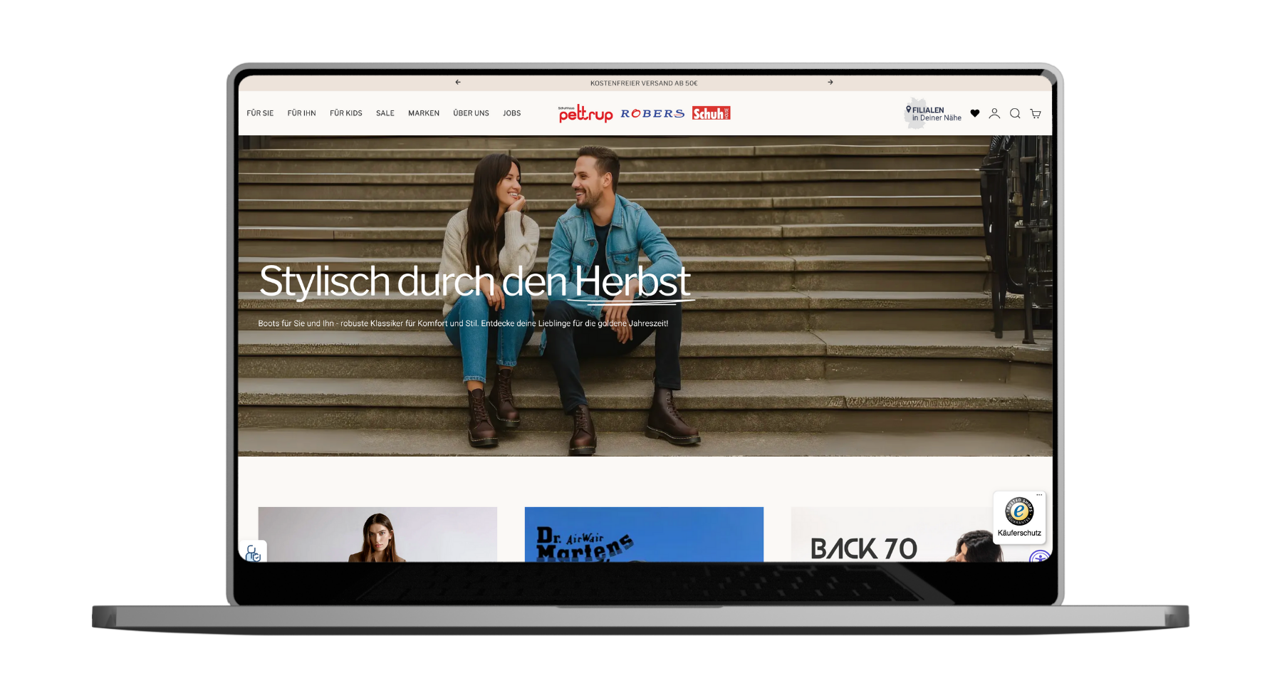 Ein weiterer Schwerpunkt lag auf der klaren Ausrichtung auf den stationären Handel. Der neue Shop sollte die 17 Filialen sichtbar in den Mittelpunkt stellen – mit einem Filialfinder sowie der Möglichkeit für Click & Collect. Besonders wichtig war dabei die Anforderung, dass Kundinnen und Kunden bei jedem Schuh direkt erkennen können, in welcher Filiale der Artikel aktuell verfügbar ist, um die Kaufentscheidung schneller und gezielter treffen zu können.